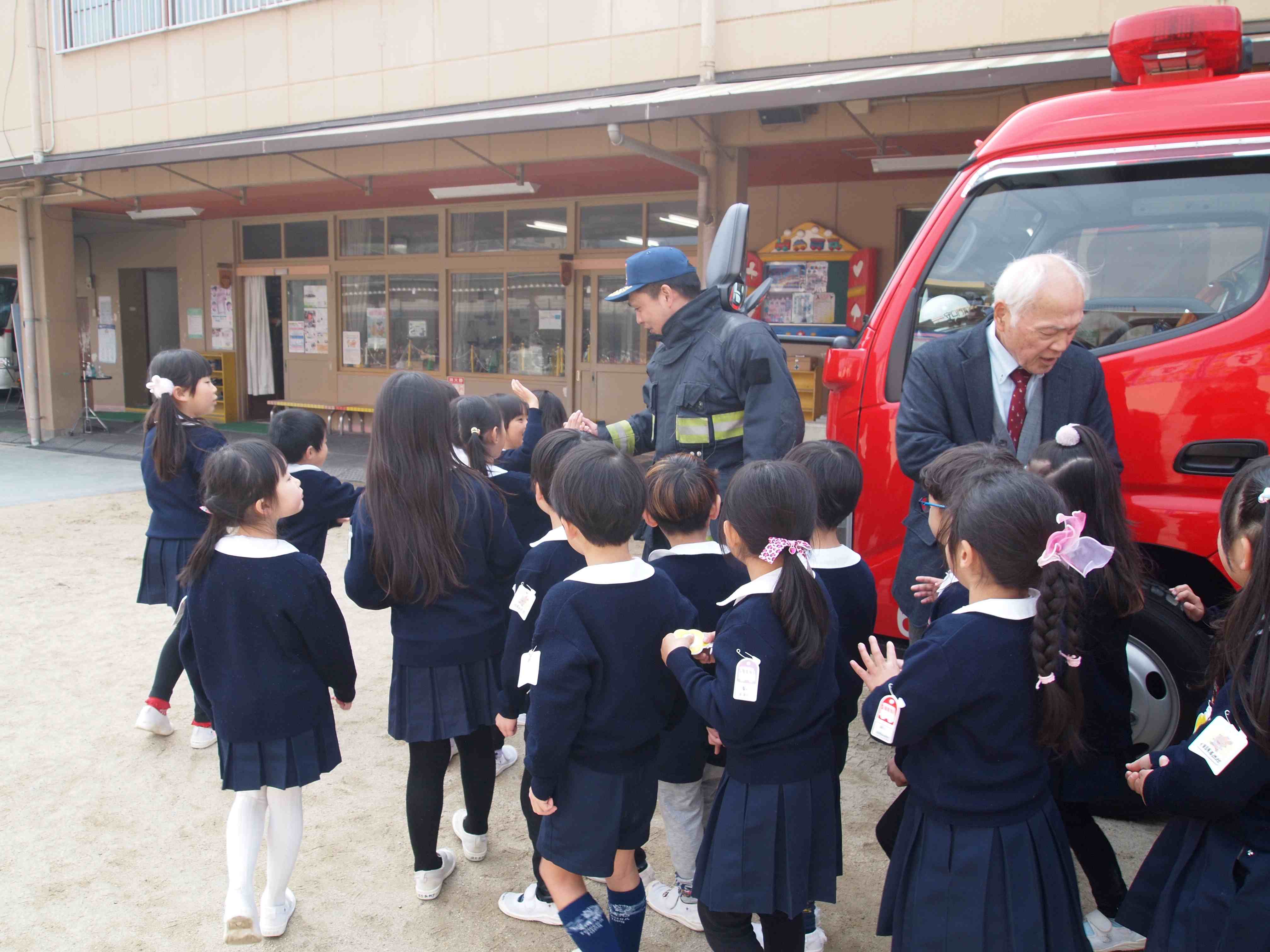 | 本日火災を想定しての避難訓練を行いました。 サイレンがなり、「給湯室から火災が発生しました。芝生に避難しましょう」との教職員の指示で、子どもたちは煙の吸い込みを防ぐために、タオルで口をふせぎ、落ち着いて避難する事が出来ました。 その後、消防士さんに来て頂き、消防士さんのお仕事についてのお話や質問にも答えて頂きました。消防車も見せて頂き、子どもたちとても嬉しそうでした。貴重な時間となり、良かったです。 |