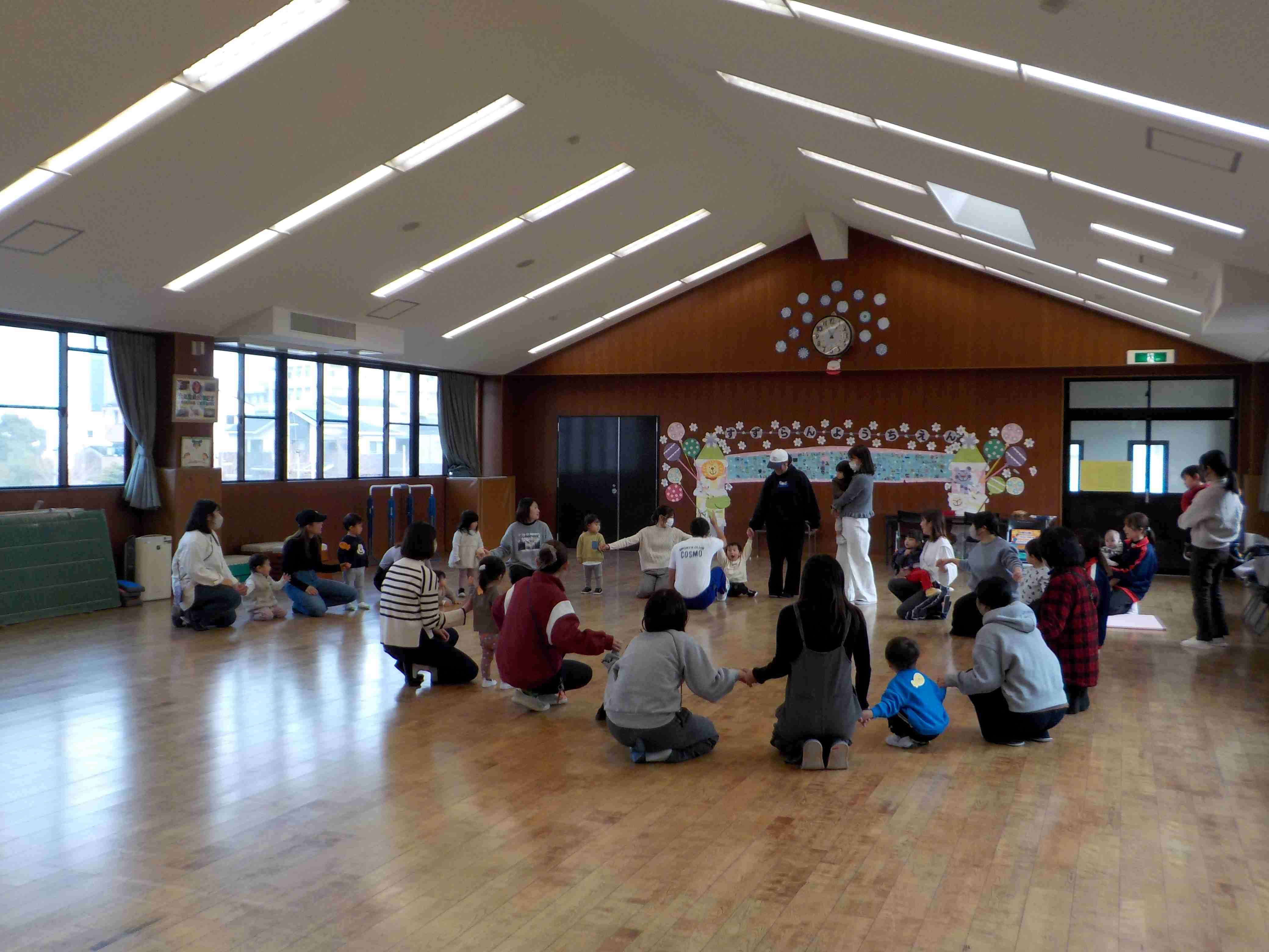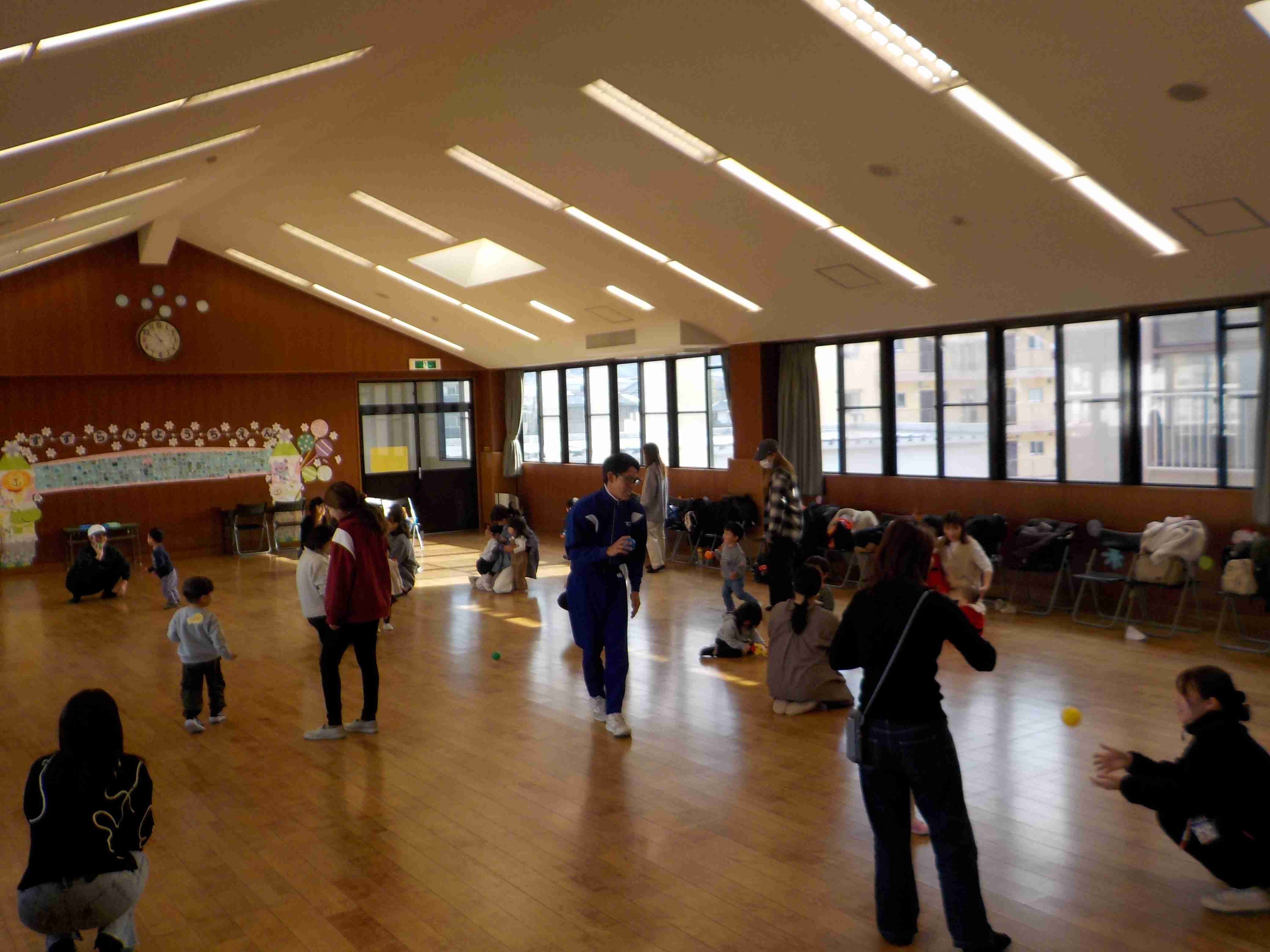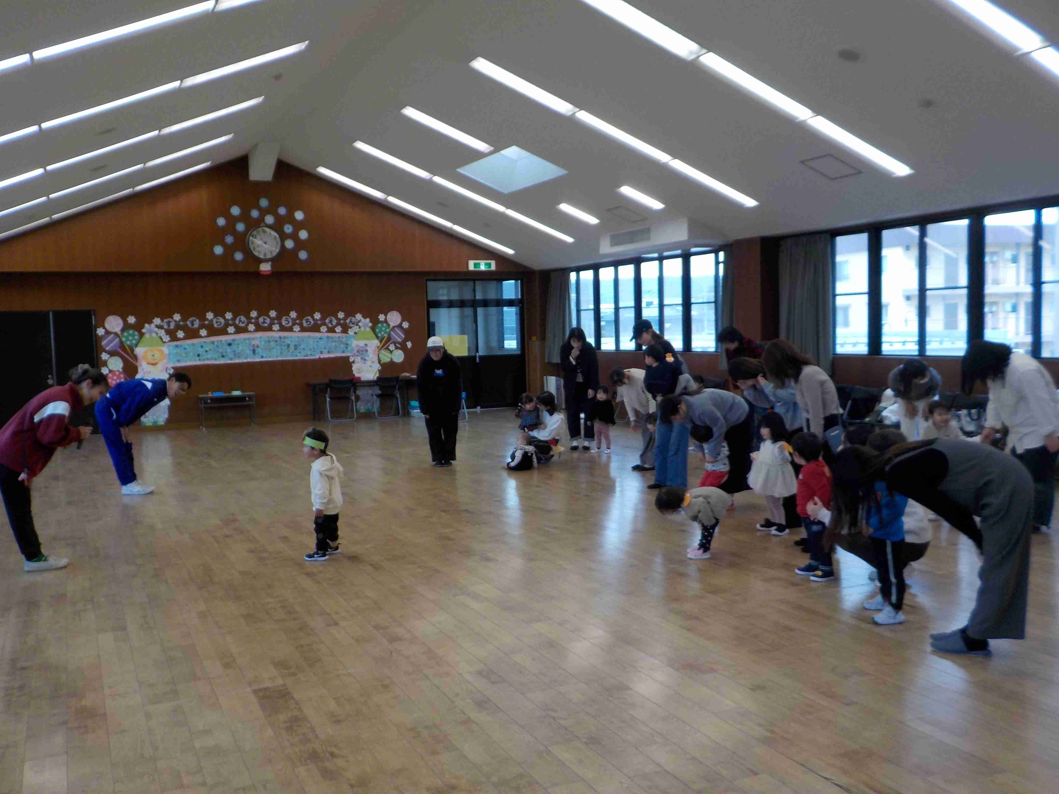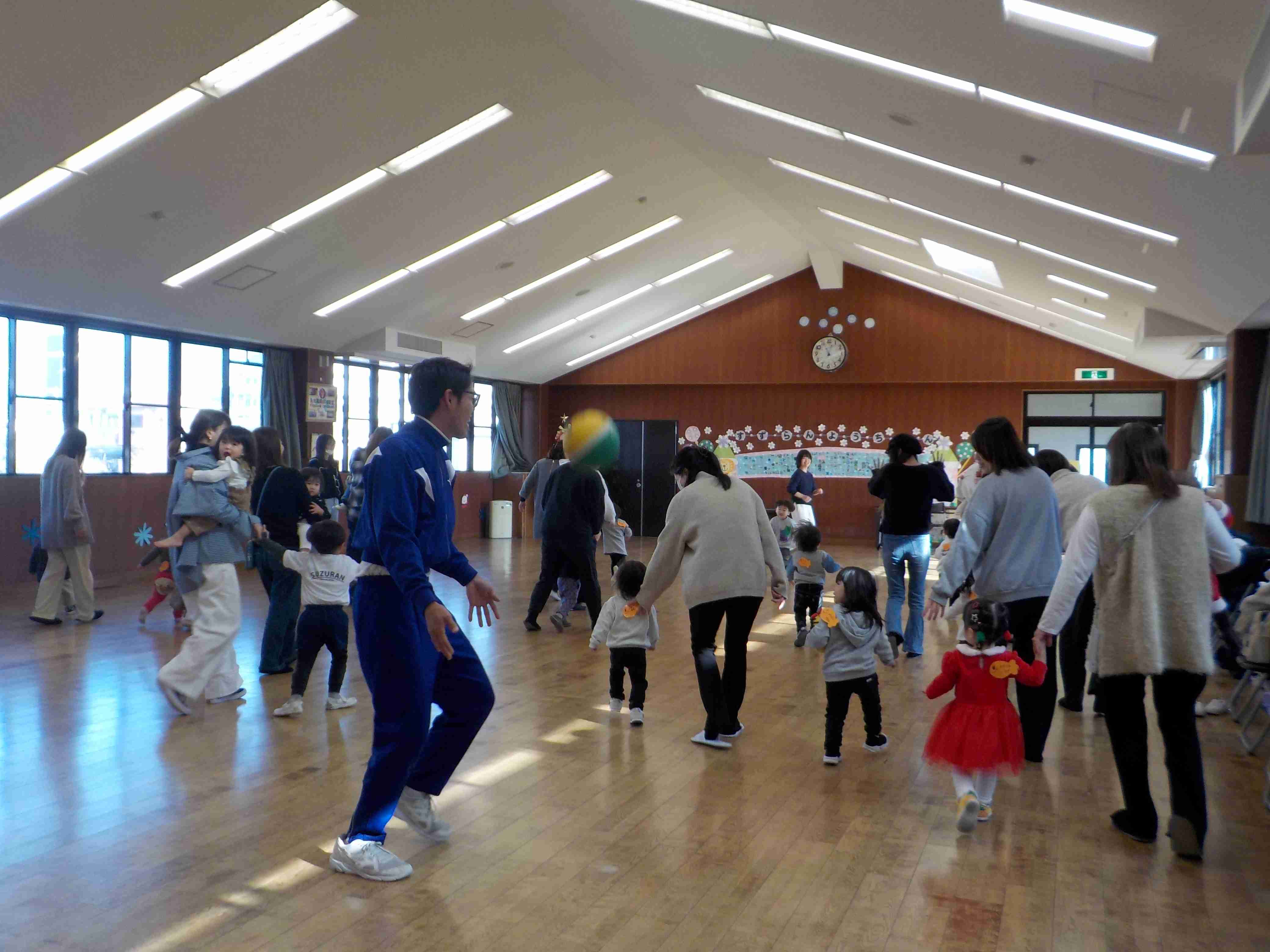 | 今日は久し振りに体育館でのスイミーでした!「広い体育館で思いっきり動いて遊ぼう!!」ということで マットや跳び箱を使ってのサーキット遊びをしました! 最初はマットだけだったのが、 どんどんと色んな器具が増えていき 沢山の障害物を越えて進んでいきました♪ ジャンプしたり、くぐったり、色んな動きが出来て 楽しそうに参加されていました! 次回のスイミーは12月18日10時半から 体育館で行います! ご参加、お待ちしております♪ |