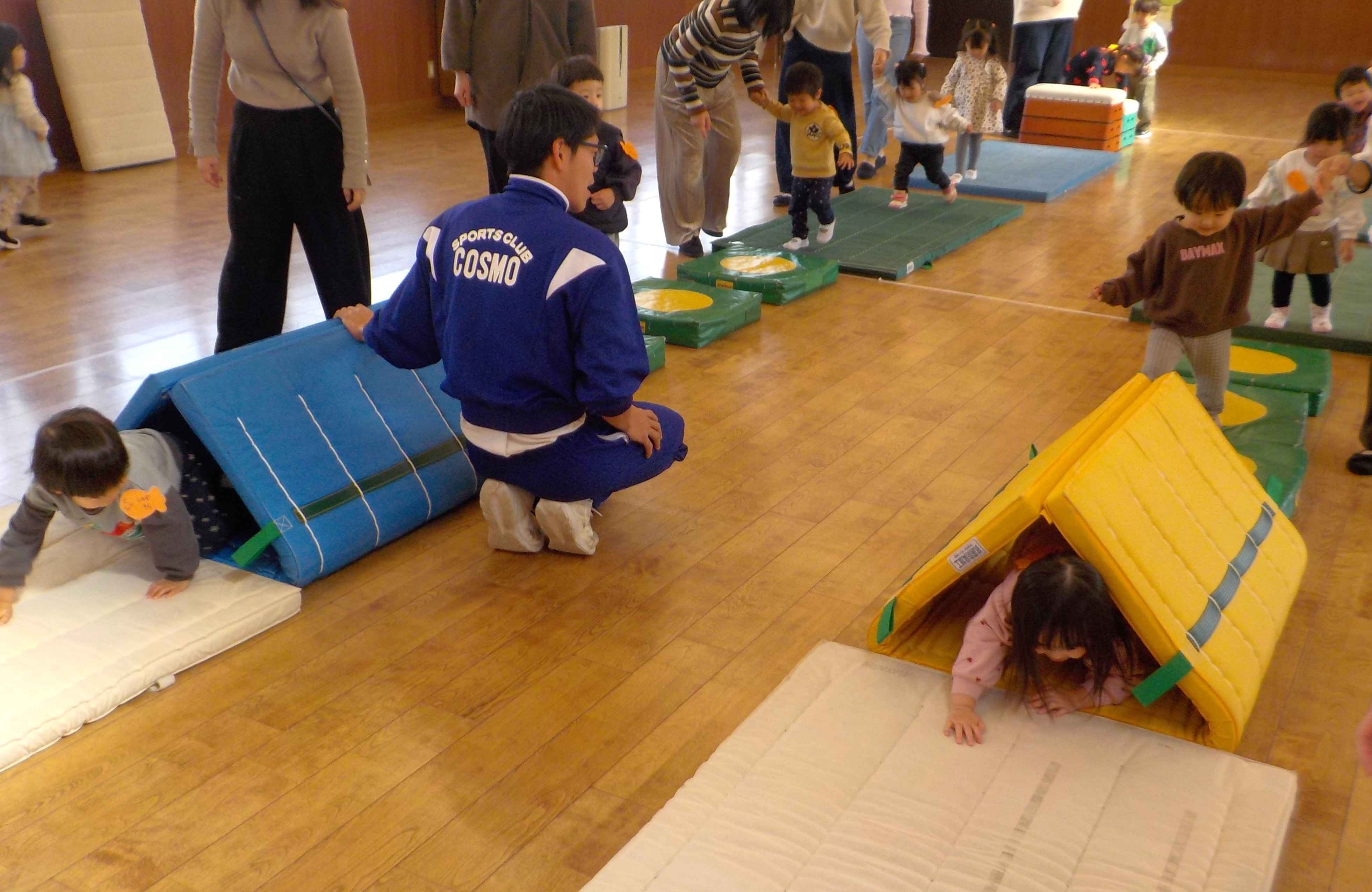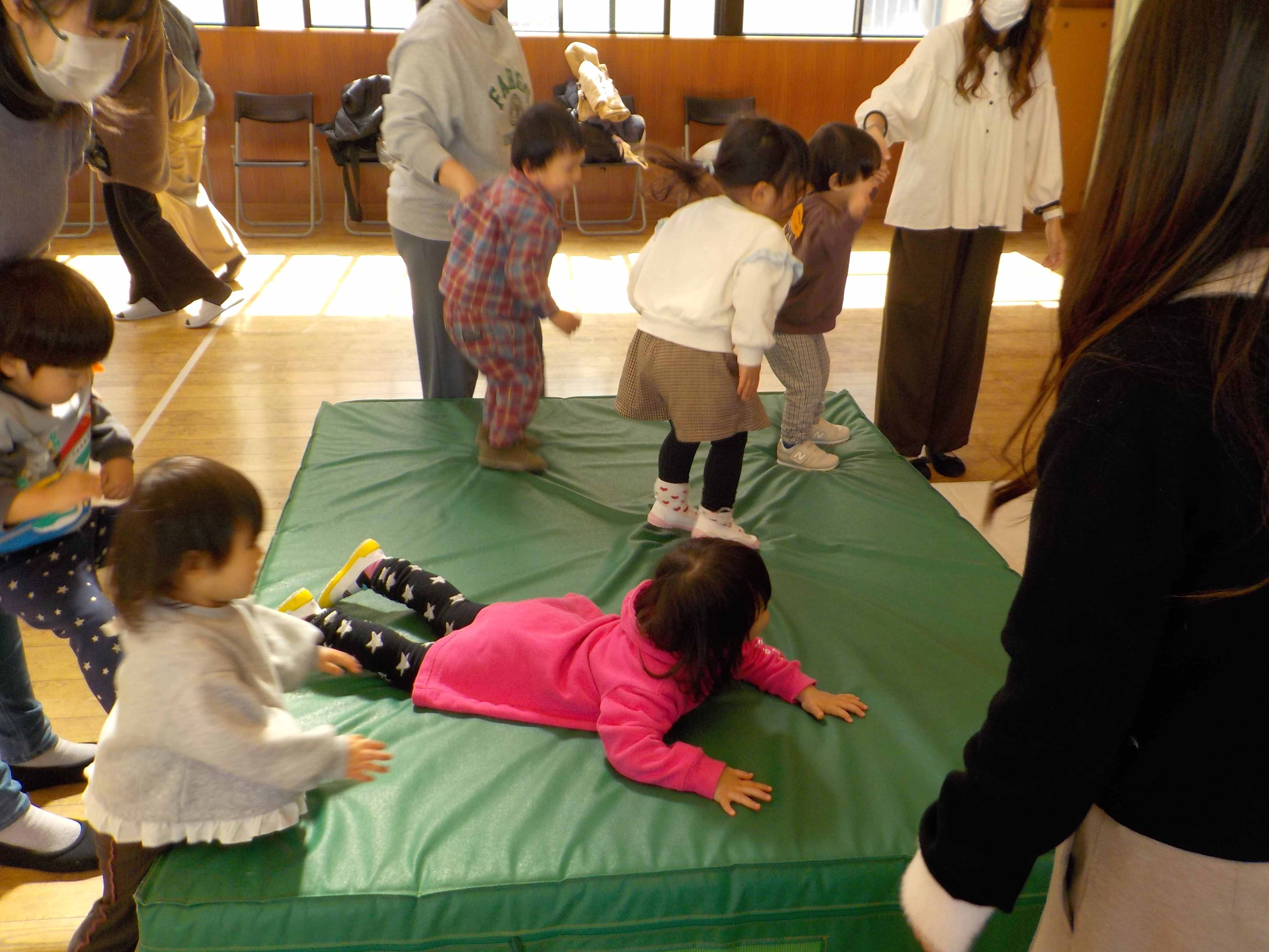 | 今日は久し振りに体育館でのスイミーでした!「広い体育館で思いっきり動いて遊ぼう!!」ということで マットや跳び箱を使ってのサーキット遊びをしました! 最初はマットだけだったのが、 どんどんと色んな器具が増えていき 沢山の障害物を越えて進んでいきました♪ ジャンプしたり、くぐったり、色んな動きが出来て 楽しそうに参加されていました! 次回のスイミーは12月18日10時半から 体育館で行います! ご参加、お待ちしております♪ |