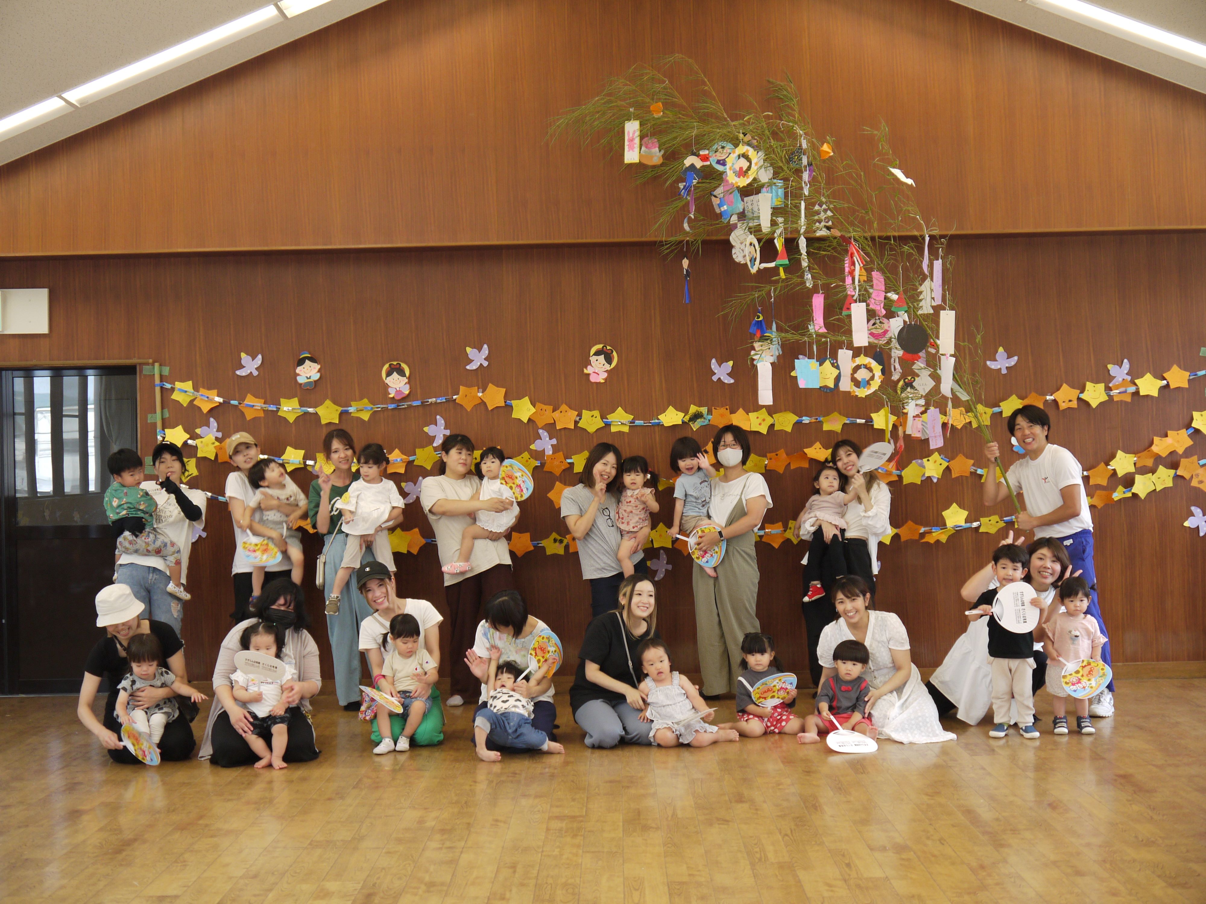 | 7月に入り暑い日が続いていますが、毎回スイミーに沢山の方が参加して頂き、職員もうれしく思います♪七夕飾りの前でみんなでハイポーズ‼ | ||