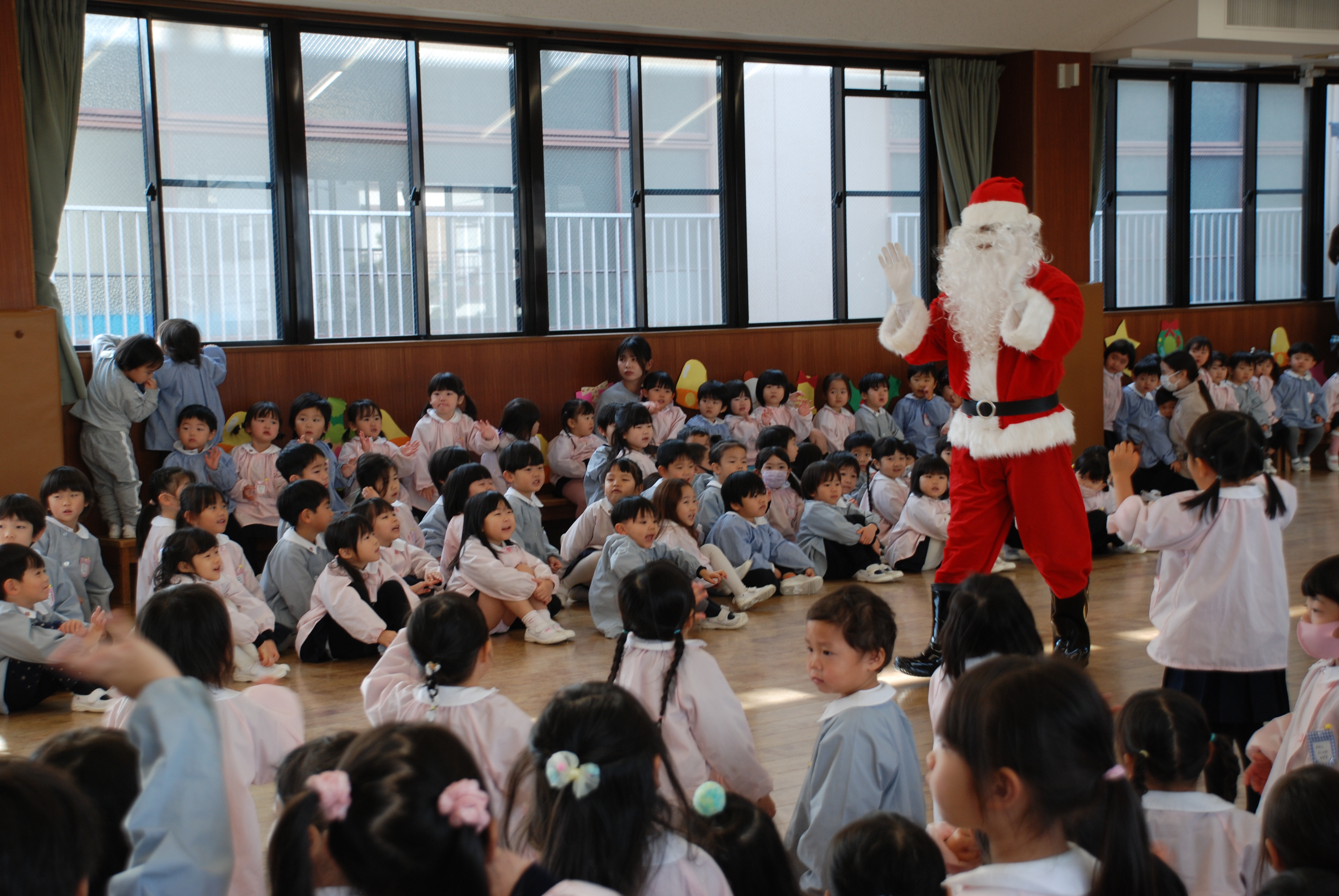 | 本日、クリスマス会にすみれ組のお友達も参加しました♪初めて見るサンタさんに少しびっくりして怖がってしまうお友達もいましたが、プレゼントをいただきニコニコ笑顔‼ 楽しい思い出ができました♪ |