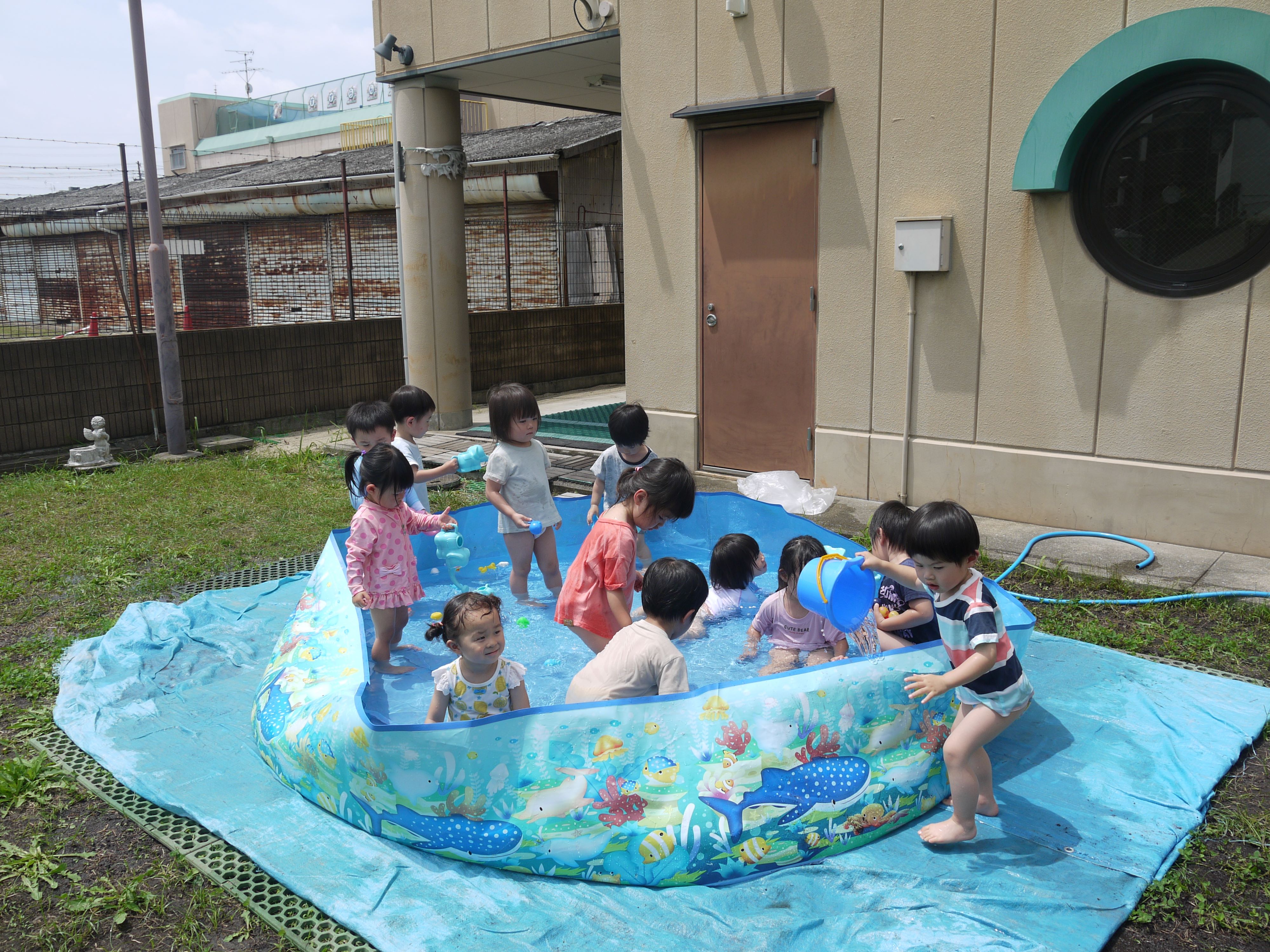 | 今年度初めてのプールあそびがありました。おもちゃをブクブクブク・・・‼ お水の掛け合いにキャー♪ みんな楽しく遊びました。 |