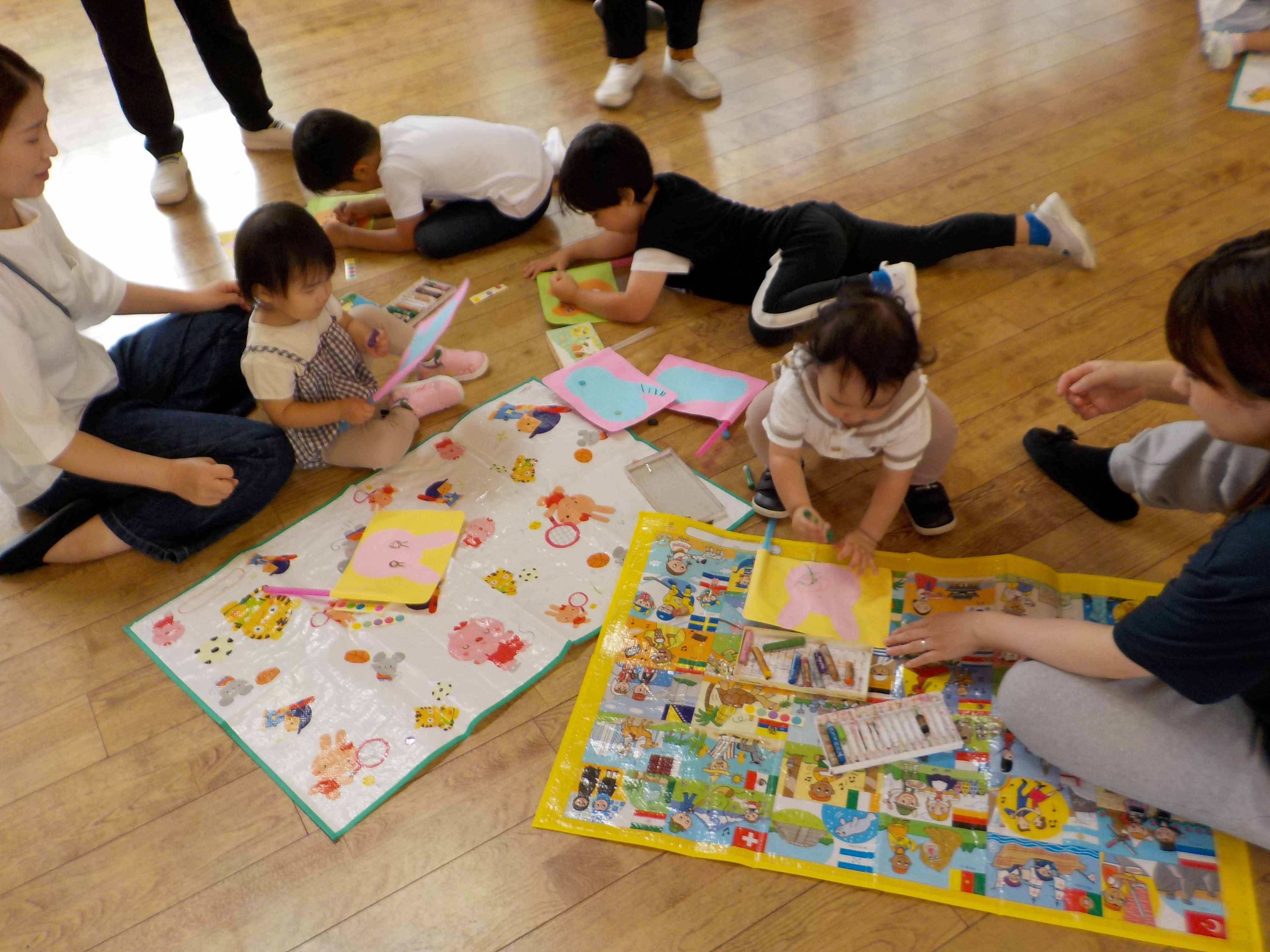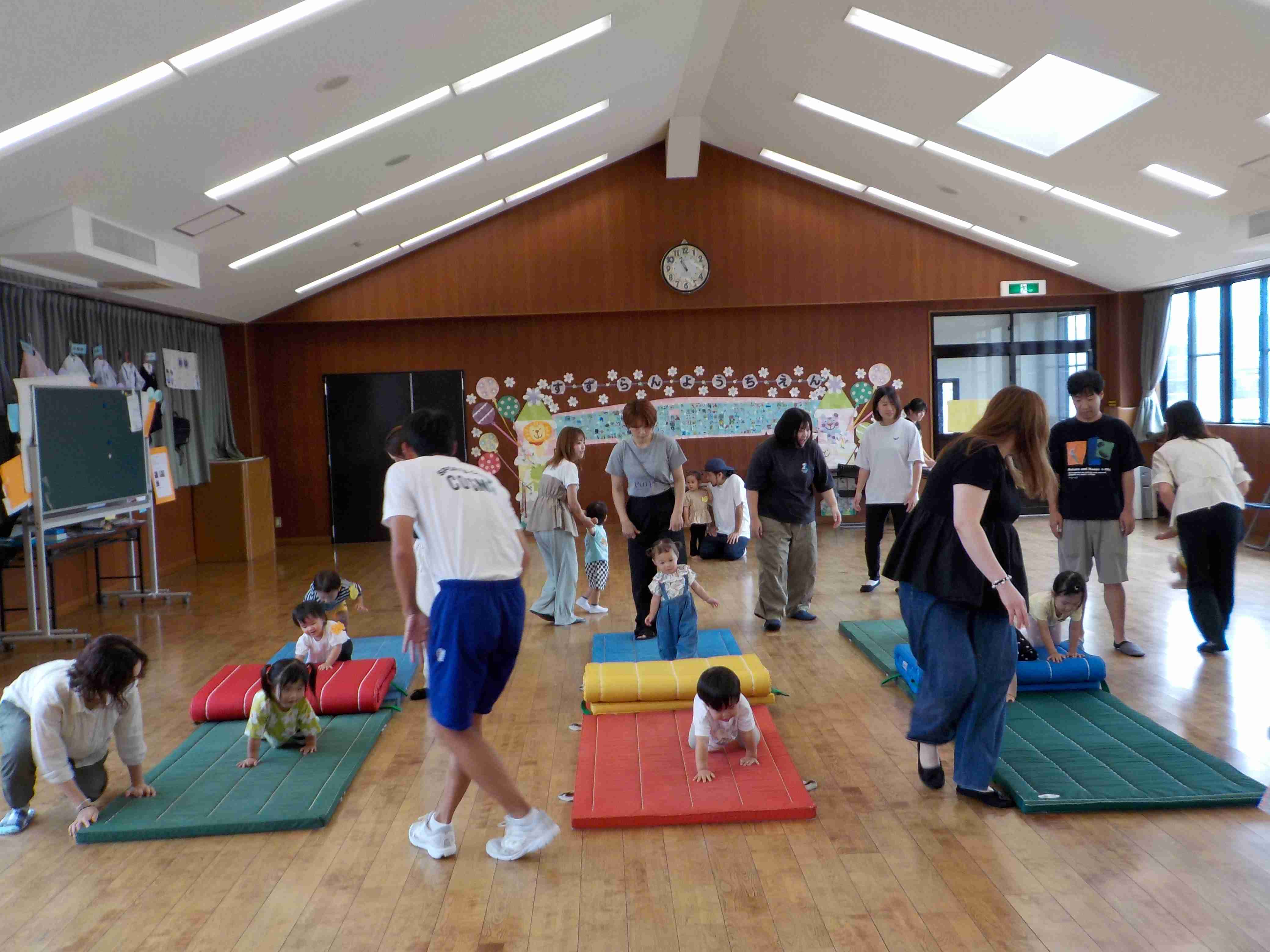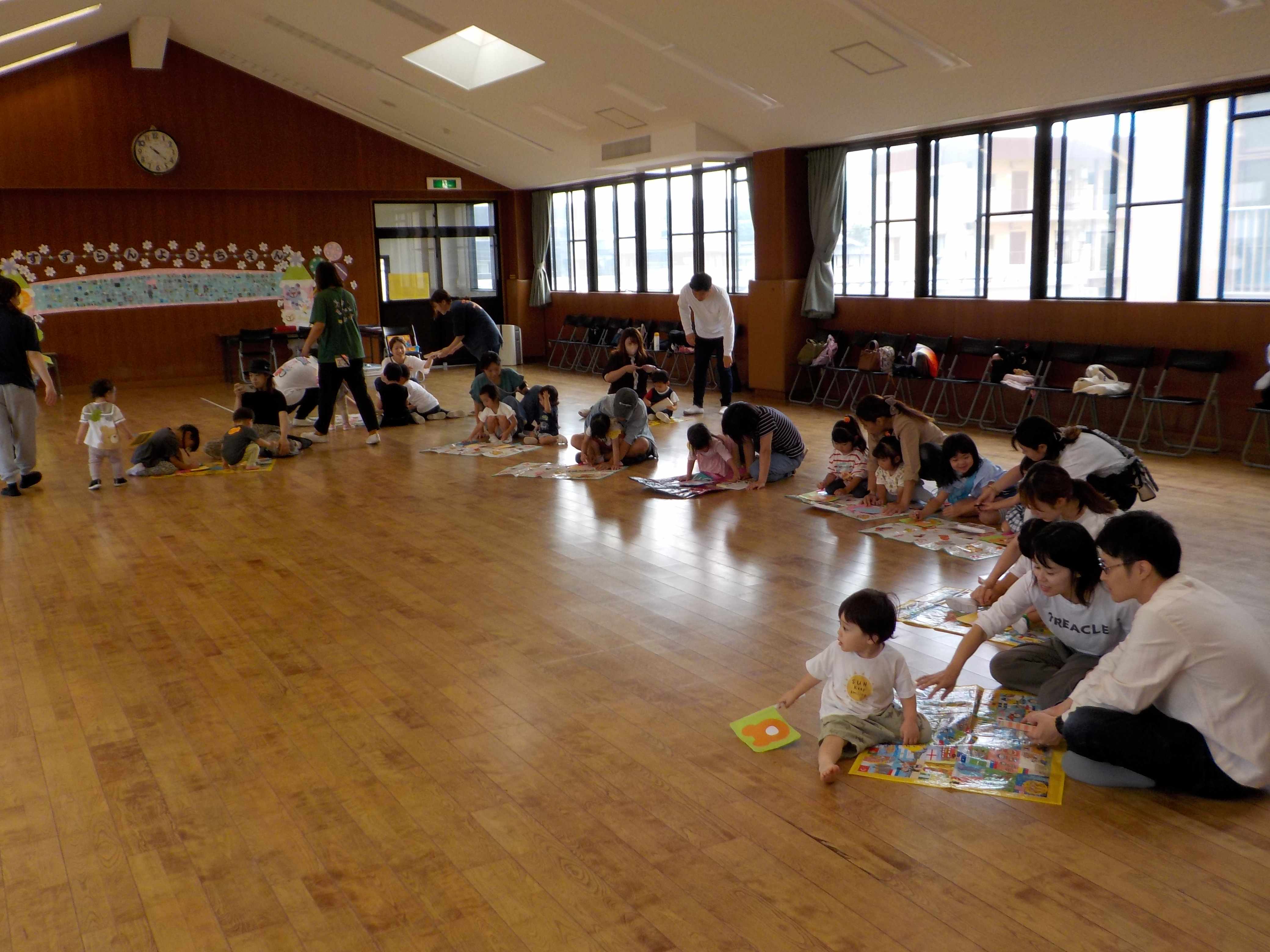 本日のスイミーに、たくさんのご参加ありがとうございました。今日は、「マット」をしました。リズム体操で、お母さんと一緒にこちょこちょ電車をして喜んでいる姿があったり、マットを使って散歩をしたり、ジャンプをしたり、ハイハイをしたり、最後は、マットの絨毯でとっても楽しく取り組むことが出来ました!ラーメン体操も日に日に上手になっていて、踊ることが出来ました!!次回は、7月17日(木)です。時間は、10時~になりますので間違いのないようにお願います。たくさんのご参加お待ちしております。 | ||