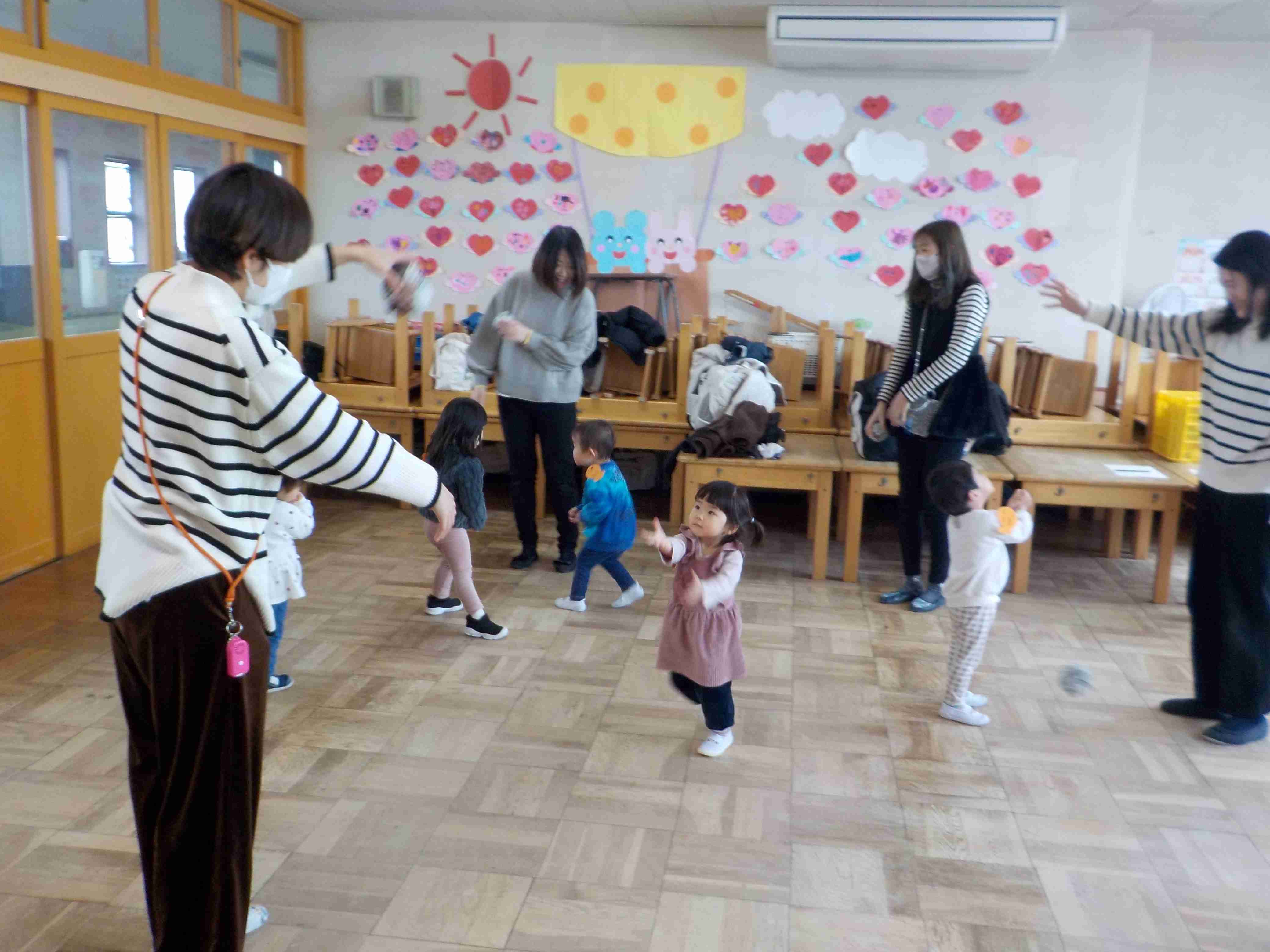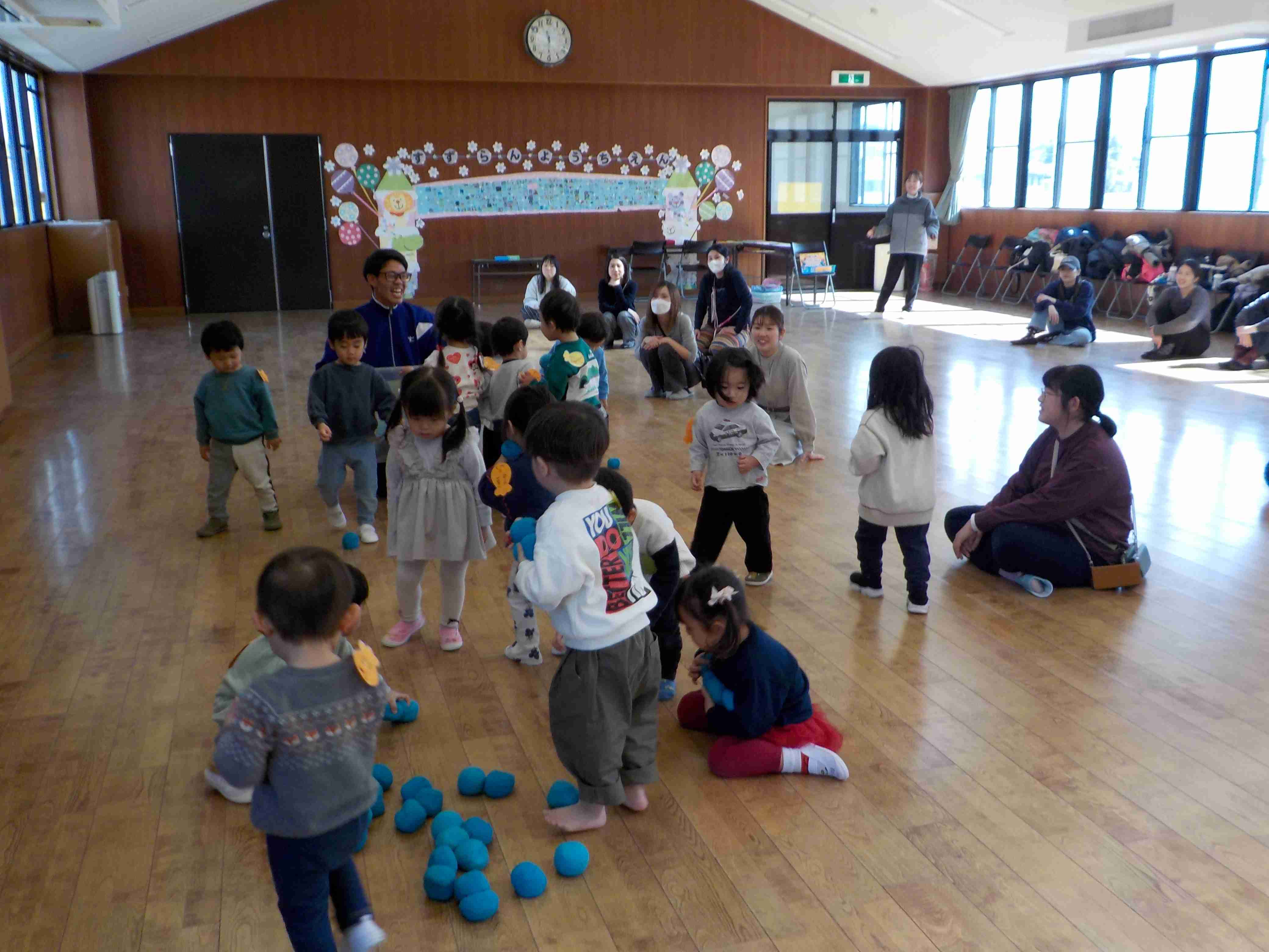 | 本日のスイミーは玉入れの玉を使って遊びました! おうちの人と玉を投げたり、キックしたり、足や頭に乗せてバランスをとったりとたくさん遊びました♪ 玉を沢山使って高く積み上げることもできましたね♪ 最後にはみんなでお片付け!なべなべ先生がうっかり落としてしまいましたが子どもたちがたくさんお手伝いして上手にお片付けできましたね♪ 次回のスイミーは2月21日(土)10時から 「幼稚園の先生と遊ぼう」があります! 沢山のご参加お待ちしております♪ |