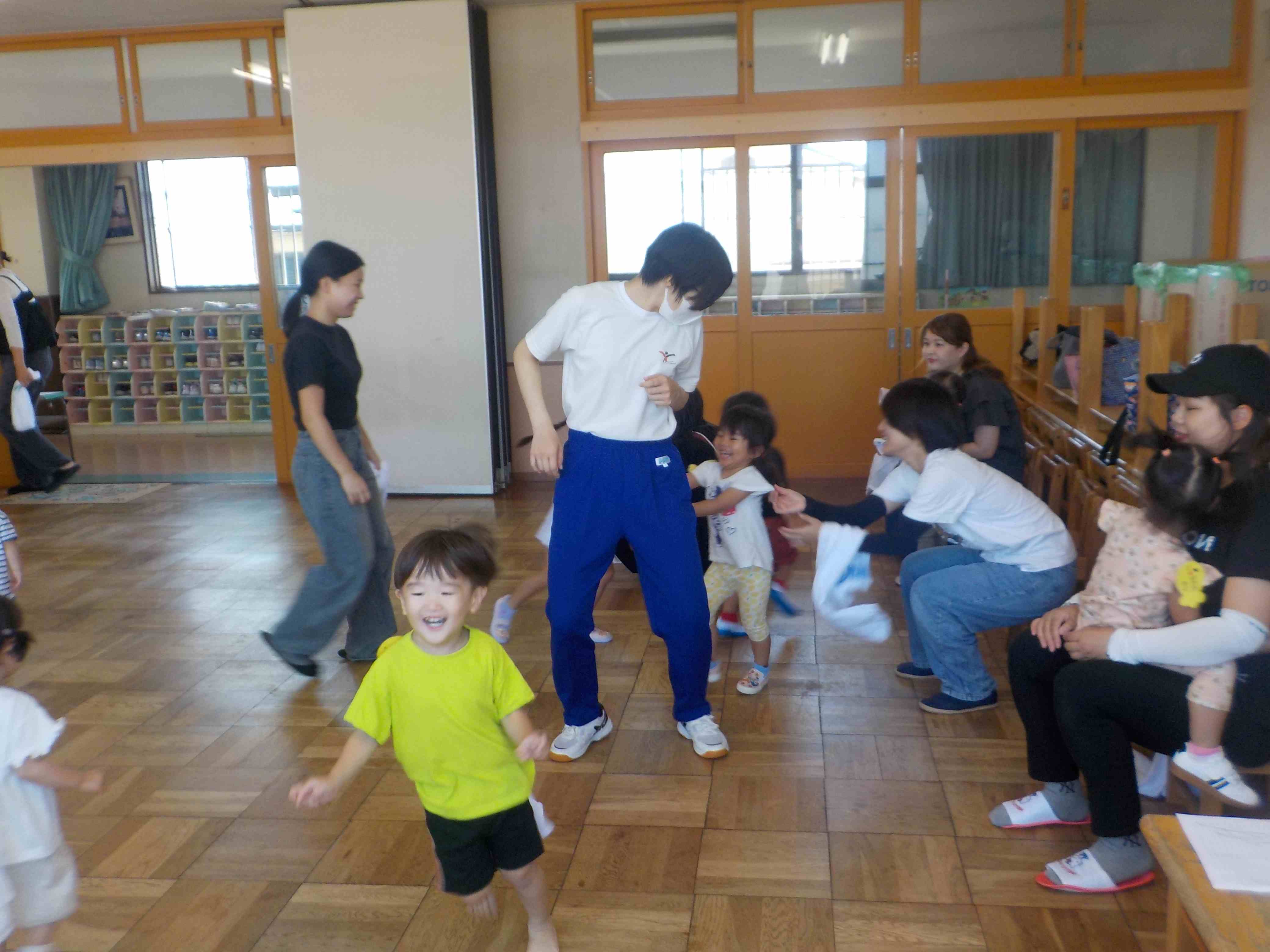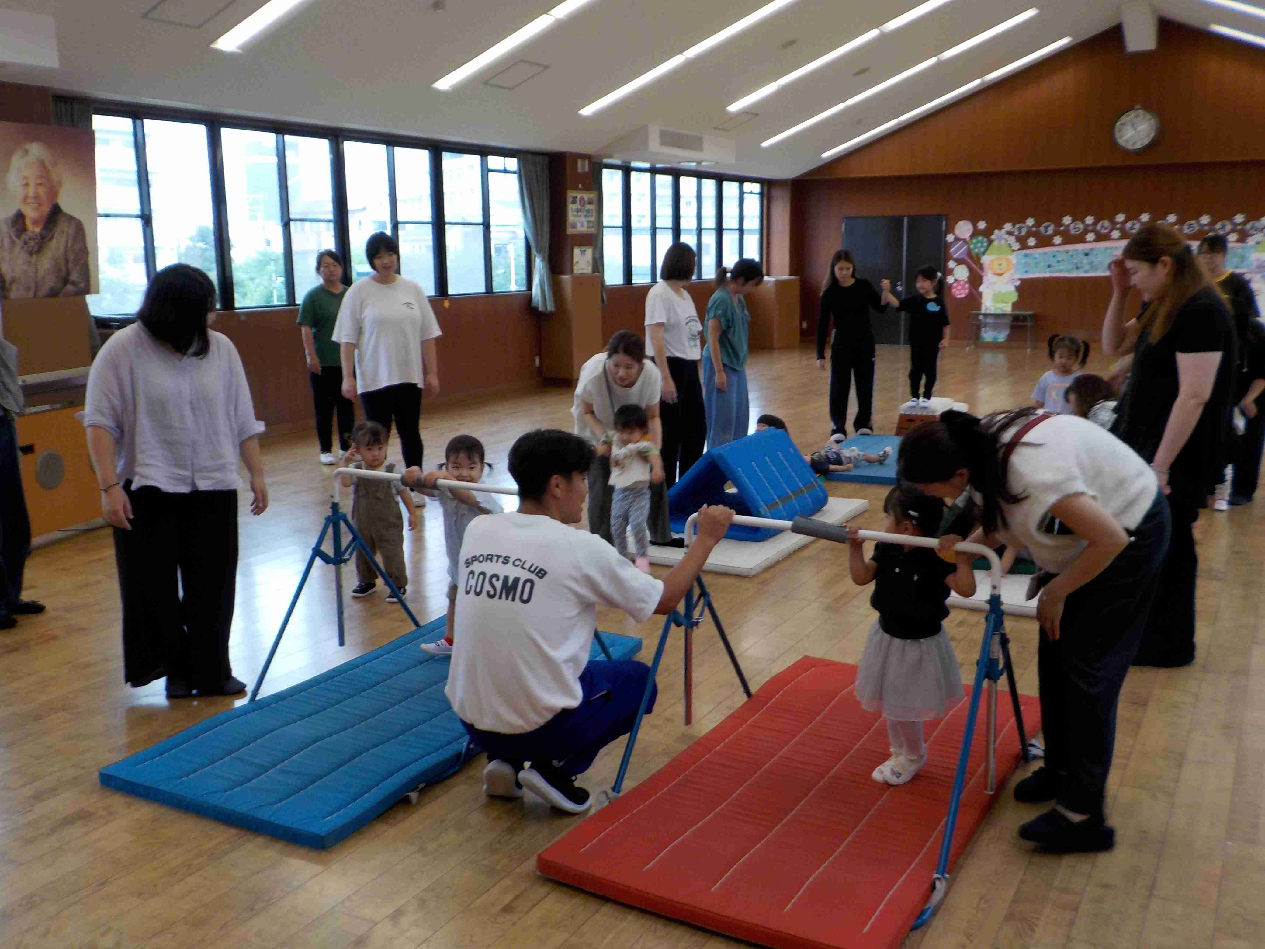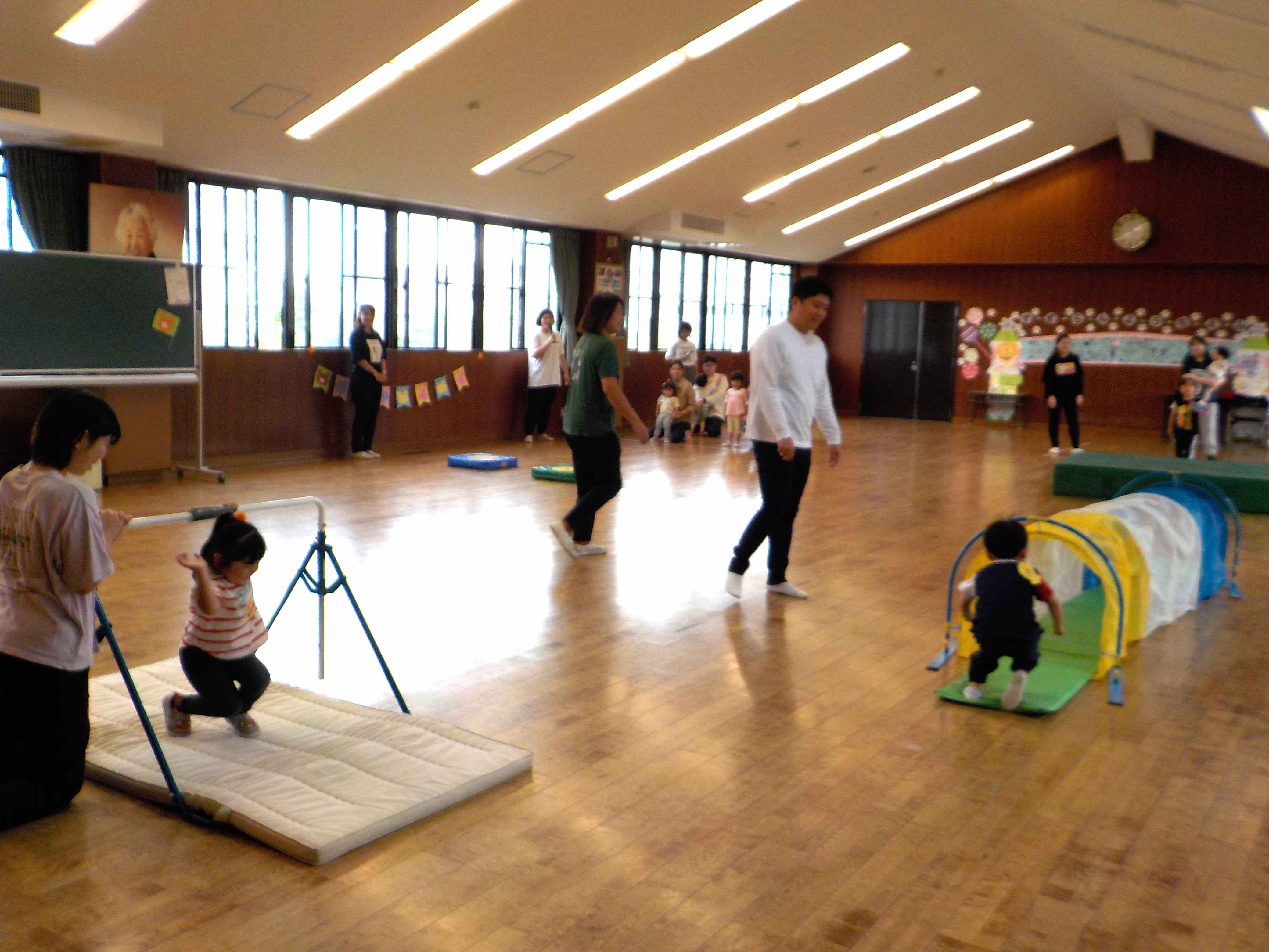 本日は足元の悪い中スイミーに参加していただきありがとうございました!新しい先生と一緒にサーキットをしました。まずは跳び箱からジャンプ!おうちの人と手をつないで上手にとべていましたね♪その後はトンネルをくぐったり鉄棒にぶらさがったり、しっかり体を動かして出来ていました!! 次回のスイミーと25日の運動会もお待ちしております♪ |