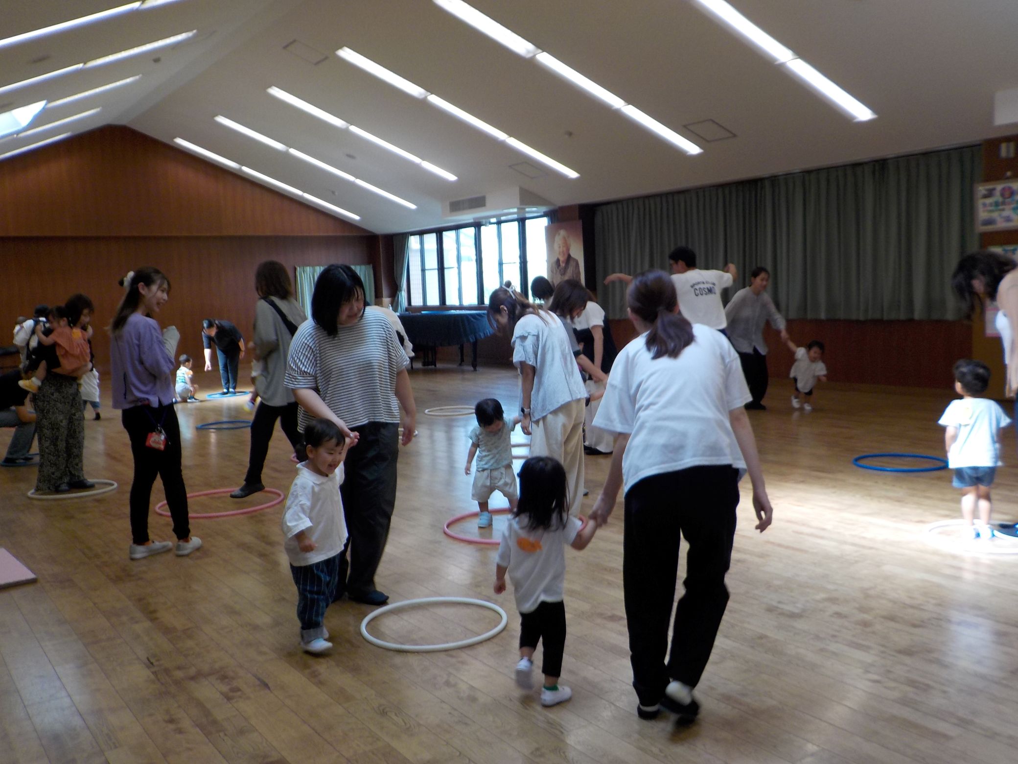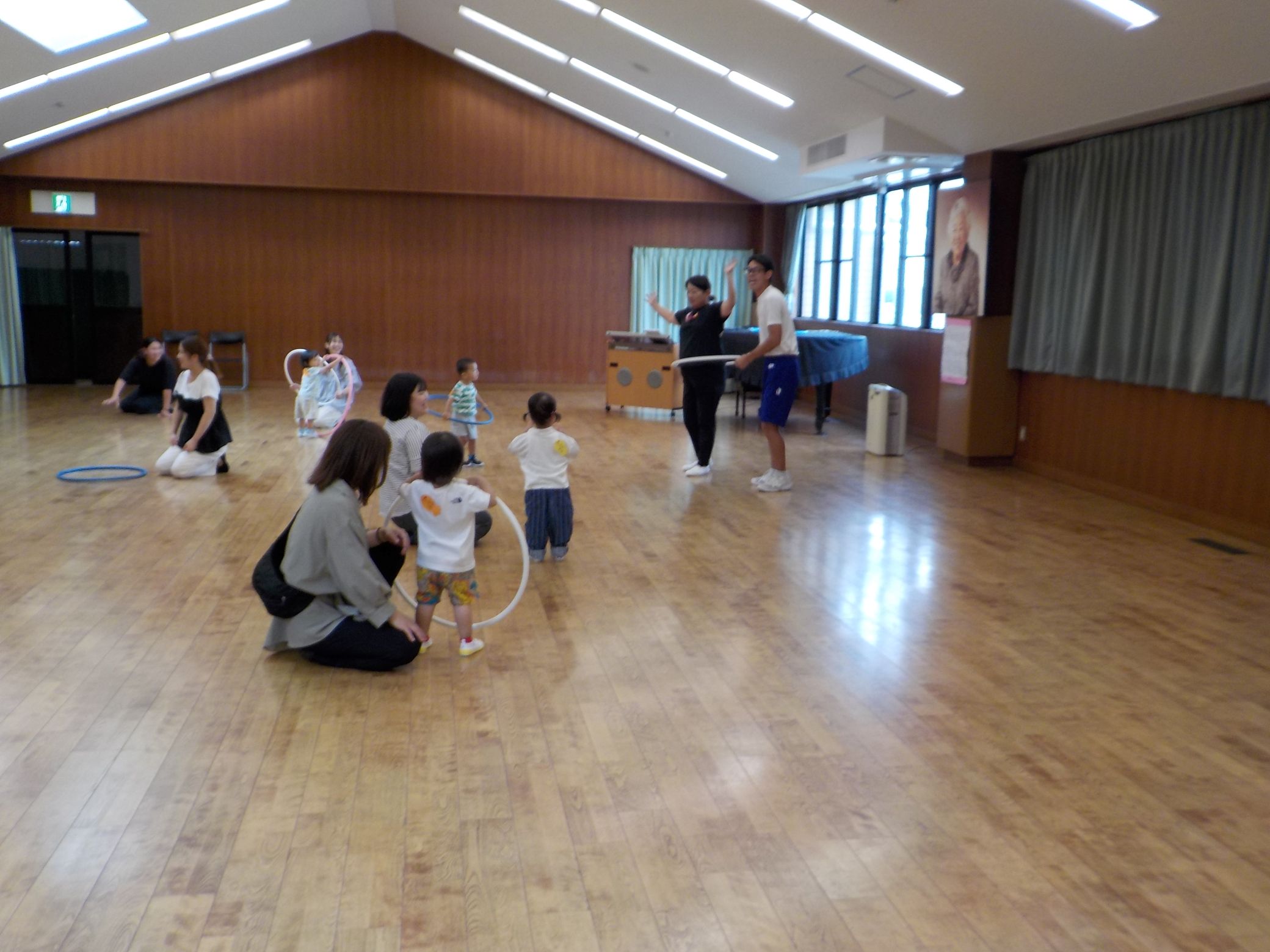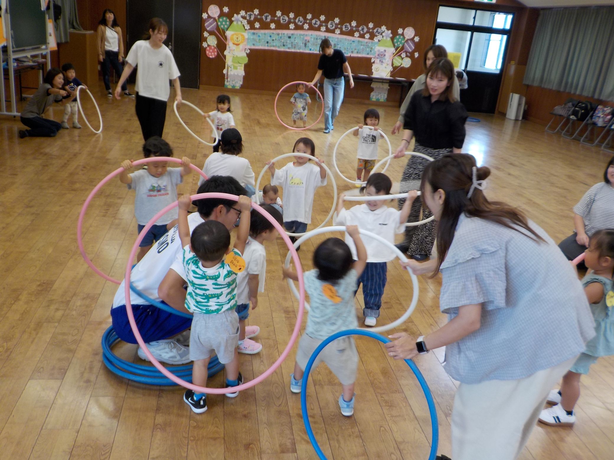 本日の親子教室【体操の先生と遊ぼう】では、フラフープを使って遊びました♪ 最初はお家の人と電車に乗ってお散歩をしたり、すれ違う先生やお友達に挨拶をしたり・・・。フラフープで先生やお家の人を捕まえたりと、楽しく体を動かすことが出来ました‼最後は、お家の人とすずらん幼稚園の先生でフラフープ対決もしました♪みんなたくさん応援してくれていました‼ 次回のスイミーは9月25日です。ご参加お待ちしています♪ |