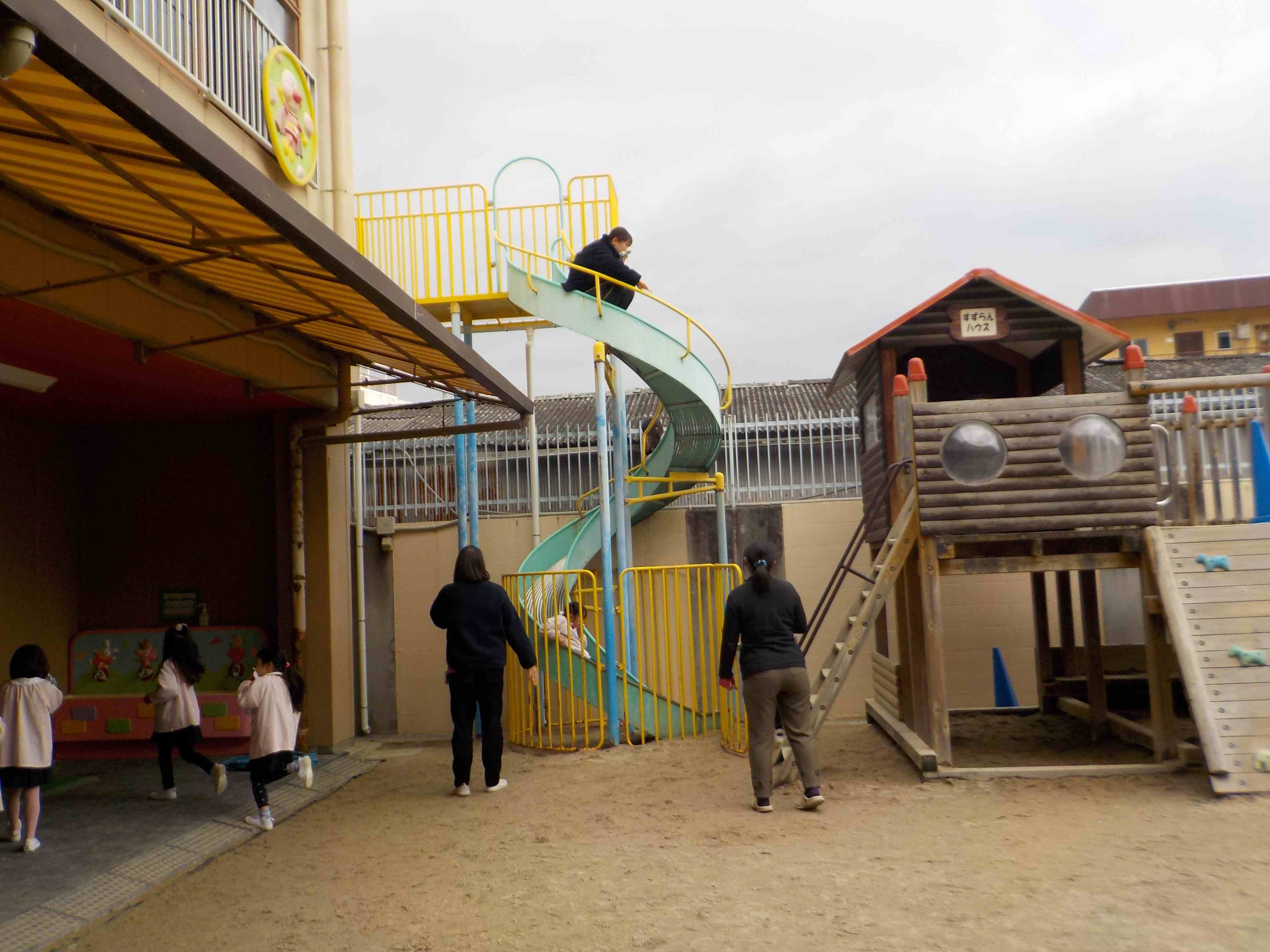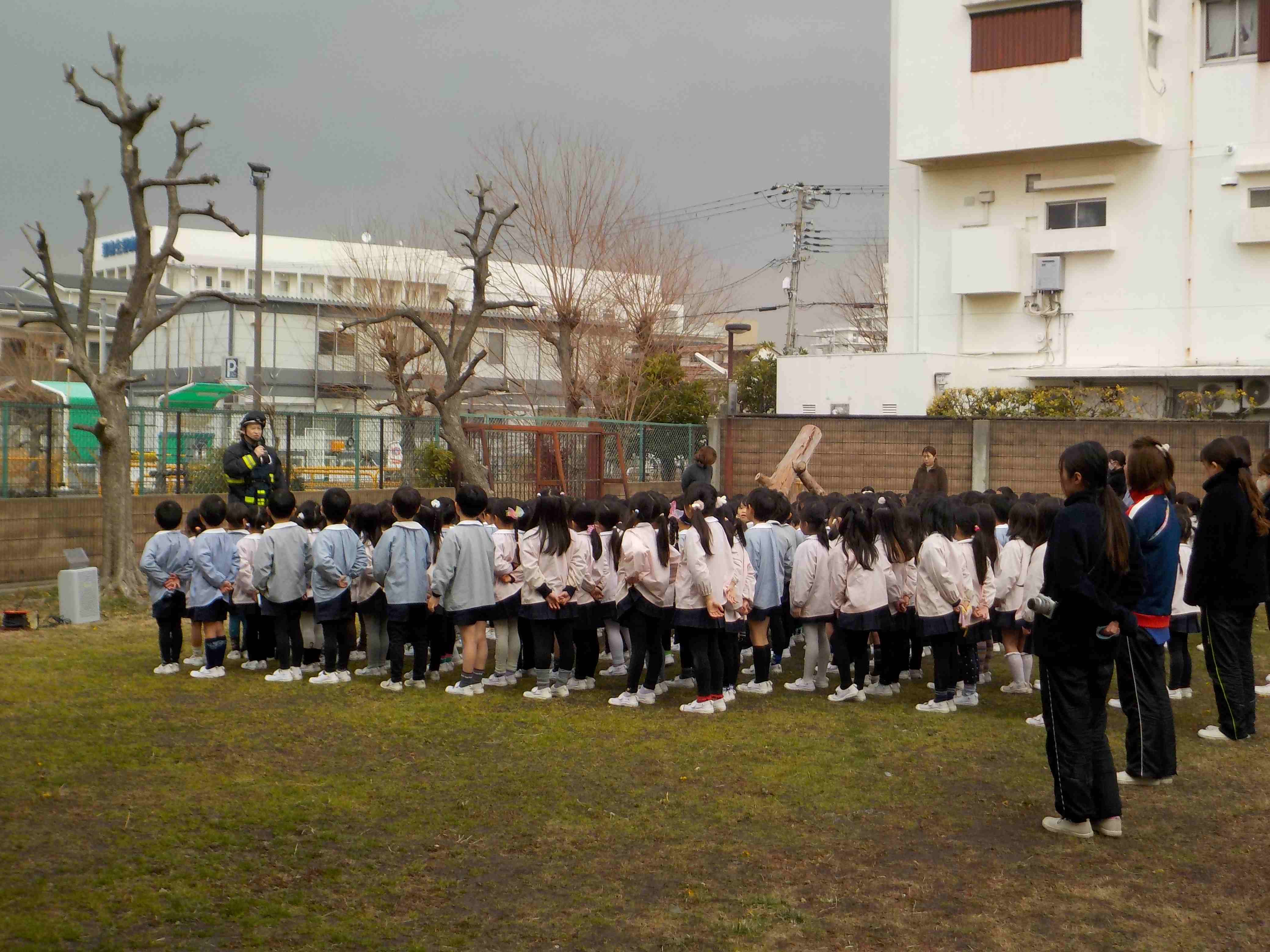 | 本日火災を想定しての避難訓練を行いました。 サイレンがなり、「給湯室から火災が発生しました。芝生に避難しましょう」との教職員の指示で、子どもたちは煙の吸い込みを防ぐために、タオルで口をふせぎ、落ち着いて避難する事が出来ました。 その後、消防士さんに来て頂き、消防士さんのお仕事についてのお話や質問にも答えて頂きました。消防車も見せて頂き、子どもたちとても嬉しそうでした。貴重な時間となり、良かったです。 |